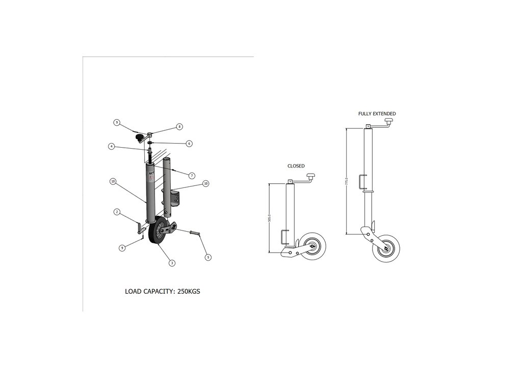 Automatické opěrné kolo - s automatickým sklápěním pro přívěsy automobilů. Průměr trubky 60 mm. maximální tlak na opěrné kolo 250 kg.