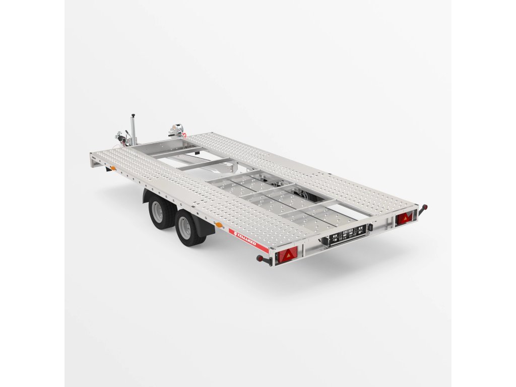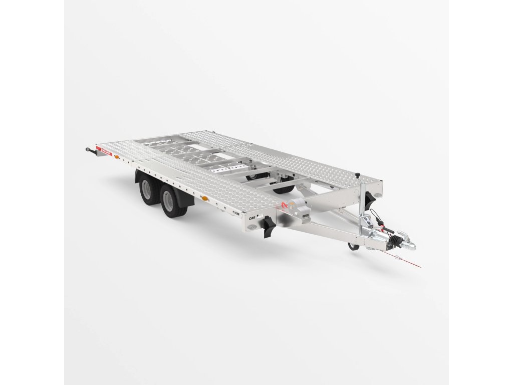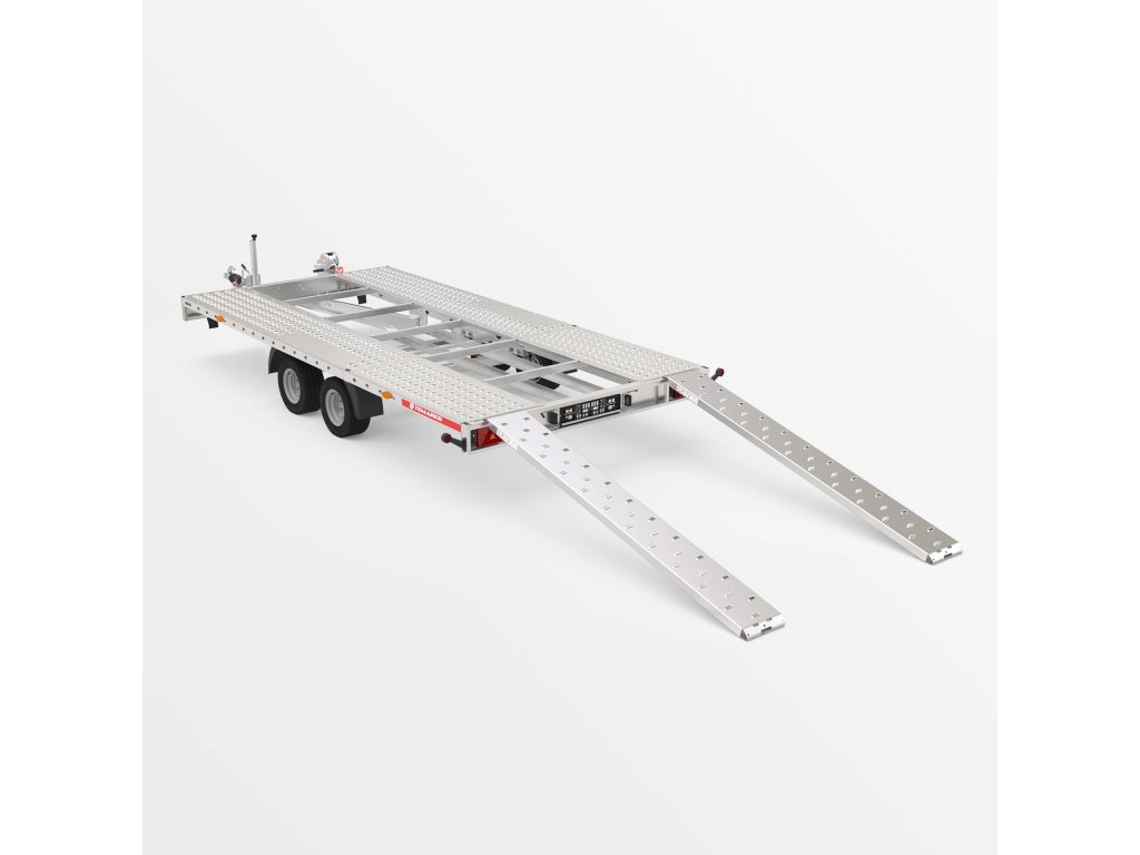 Přívěs pro přepravu vozidel s robustní svařovanou konstrukcí. Vybaven automatickým opěrným kolem, četnými úchyty pro přepravní popruhy, navijákem usnadňujícím nakládku, ocelovými nájezdy a klíny pod kola.