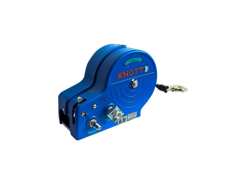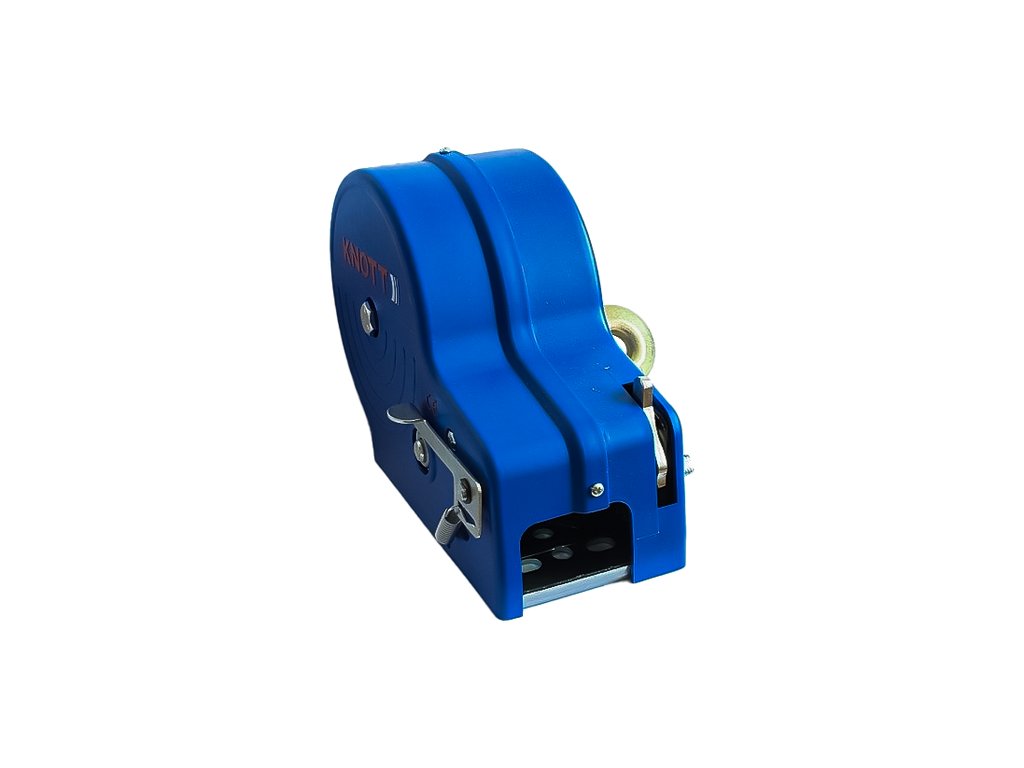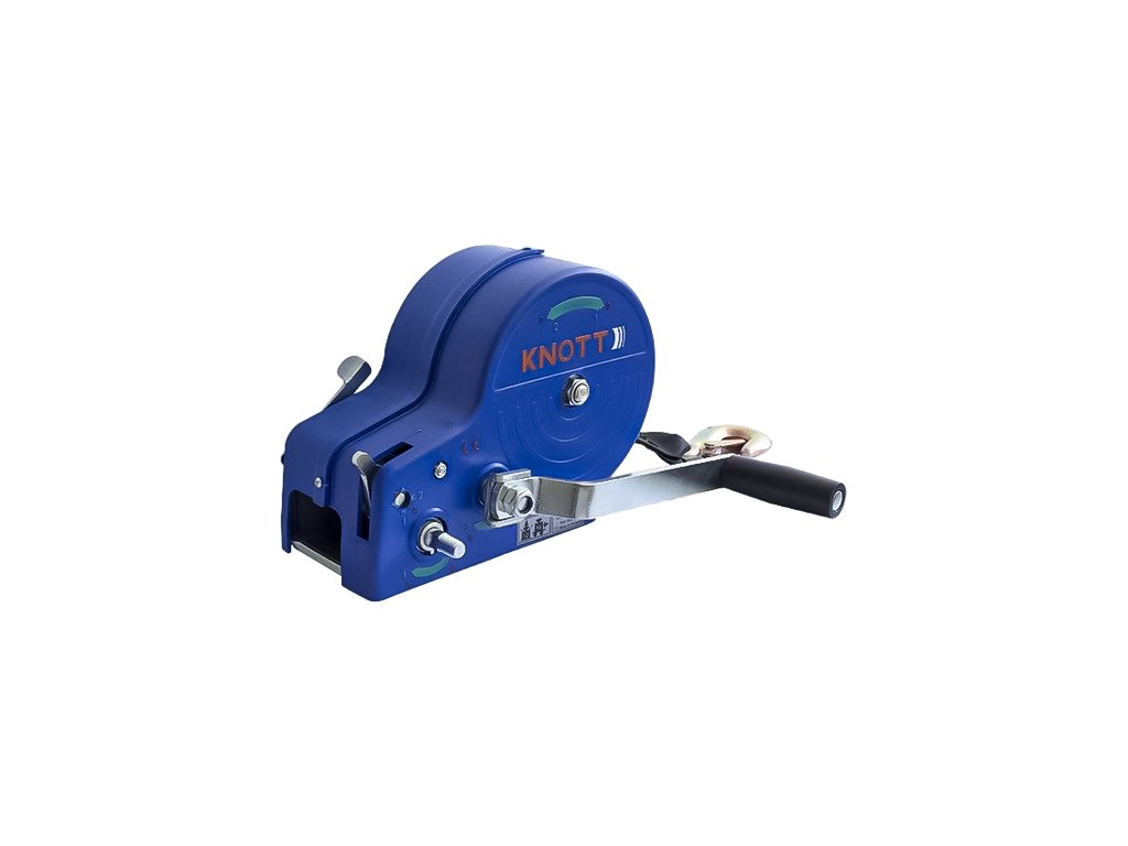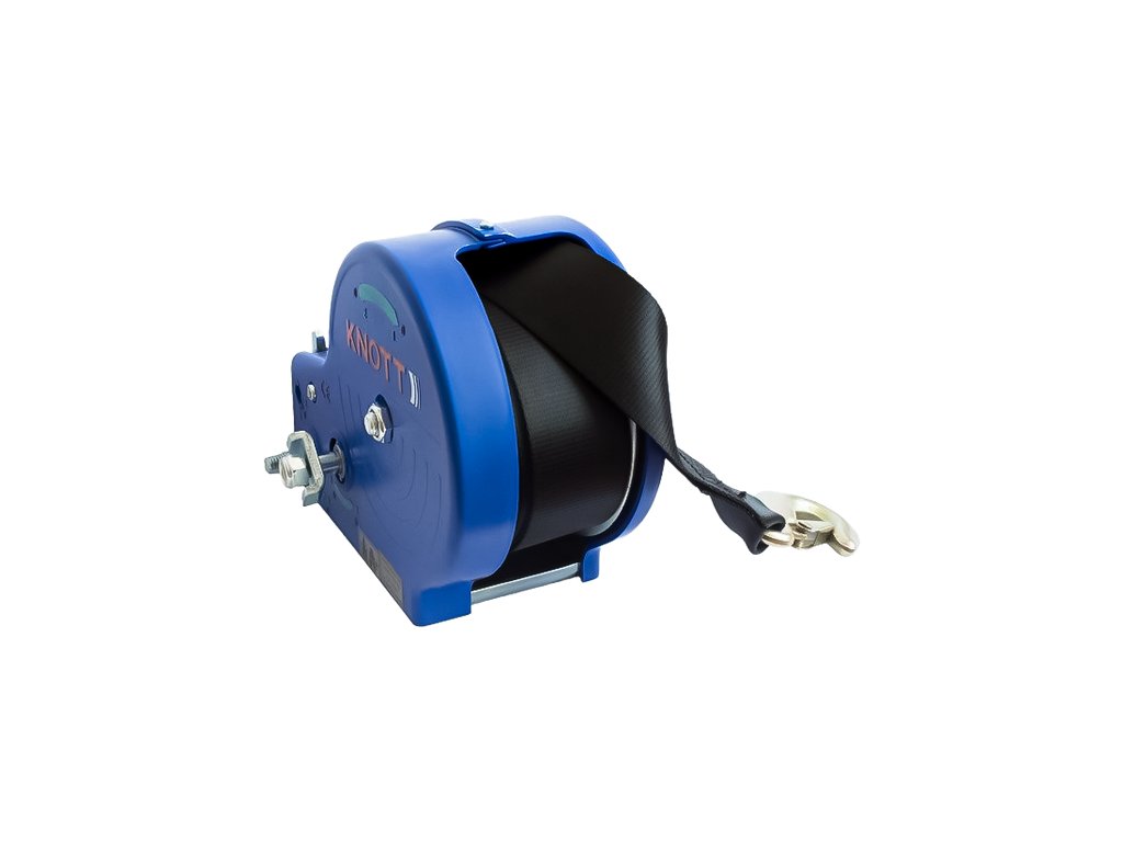 Ruční naviják KNOTT na 1150 kg s popruhem, v modrém pouzdře vhodný pro přívěsy lodí.